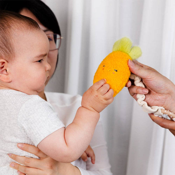 Our Carrot & Green Peas is made from polyester plush and features a soft rattle to enhance the play experience.