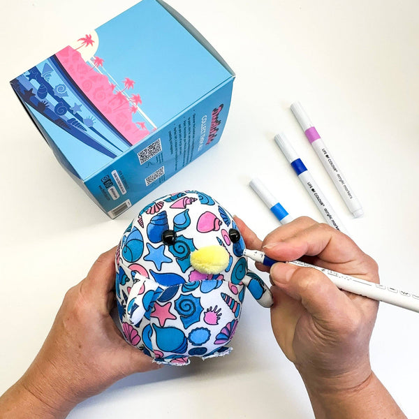 What’s in the Kit * 1 x Pebbles the Penguin plush toy with seaside doodle designs in a colourful box * 6 x Acrylic paint pens in coordinated ocean hues (blues + pinks)