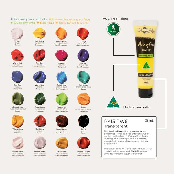 Global Colours’ Eco-Friendly – Mixed 24 Colour acrylic paint set – 36ml Acrylic Paint Set contains the following colours: Black, Cool Blue, Cool Red, Cool Yellow, Red Oxide, Warm Blue, Warm Red, Warm Yellow, White,Yellow Oxide, Orange, Magenta, Purple, Cobalt Hue, Turquoise, Green Oxide, Green Deep, Green Light, Fawn, Burnt Sienna, Metallic Pearl, Metallic Silver, Metallic Gold, and Metallic Copper.
