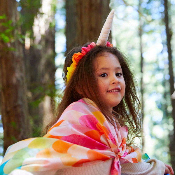 Magical Creatures Playsilks are 35 x 35-inch squares made from gorgeous, heavyweight (8 momme) 100% pure silk and printed in our limited edition Rainbow Unicorn print. Why Children LOVE Playsilks: Playsilks are inspiring, magical toys that children will be drawn to play with time and time again. The simplicity and open-ended nature of Playsilks tap directly into the child’s creative potential. * Open-ended play with Playsilks allows children to express their imagination and supports their independence. * Nourishing the senses with Playsilks gives the child an amazing tactile experience. * Growing with the child sets our Playsilks apart from any other toy, allowing for a limitless range of play possibilities, and years of lasting play value. Give your child a Playsilk and you’ll be amazed by all the ways they play! Designed in California by Sarah, a mother of 3 Waldorf children.