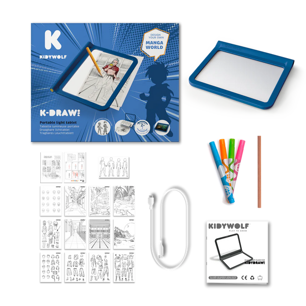 Create your own Manga world including scenery, avatars and outfits! A clever decal system allows children to combine faces, hairstyles, outfits, and expressions endlessly – over 1000 possibilities! The double-sided, fluorescent light-up drawing board offers a space for free, fun, and creative expression. A complete tool for developing style, imagination, and patience, all while having fun away from screens.